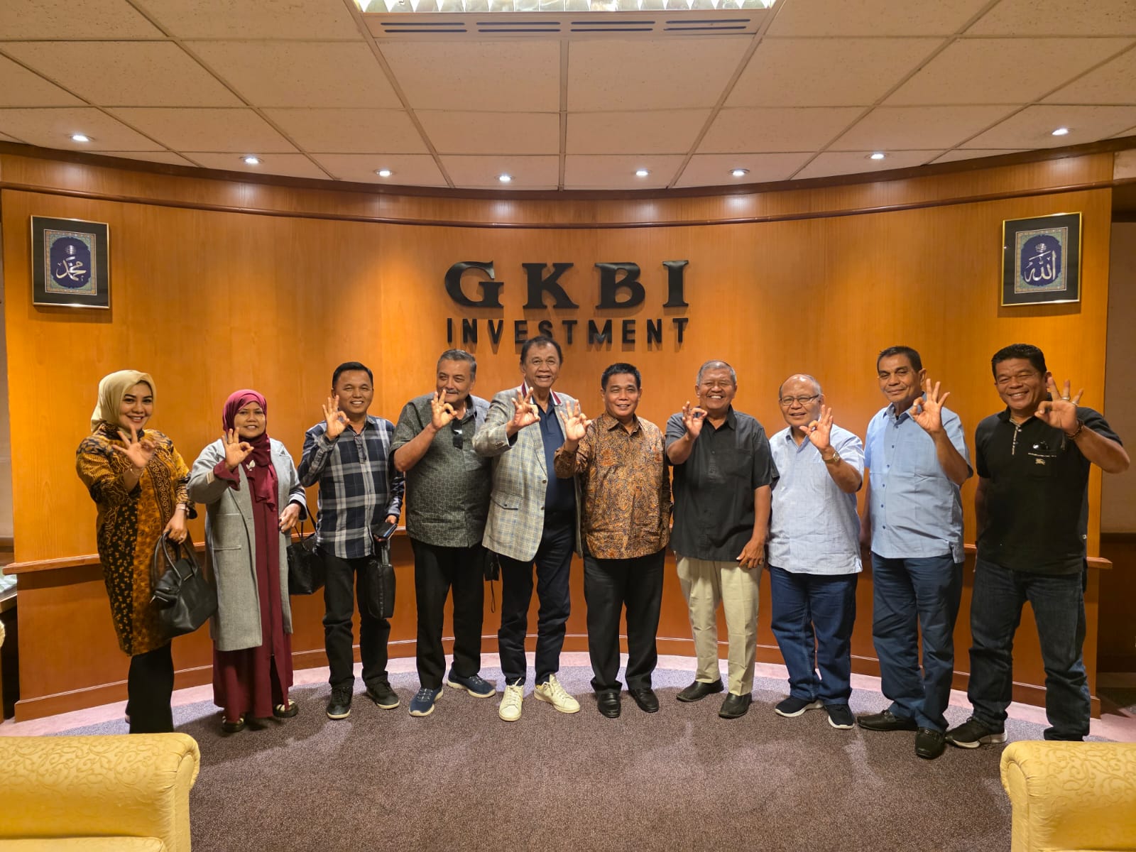 Foto bersama yang diabadikan di lobi utama kantor GKBI Investment menandai momen penting dalam kunjungan ini, di mana seluruh peserta menunjukkan semangat kebersamaan dengan pose salam canting yang khas.