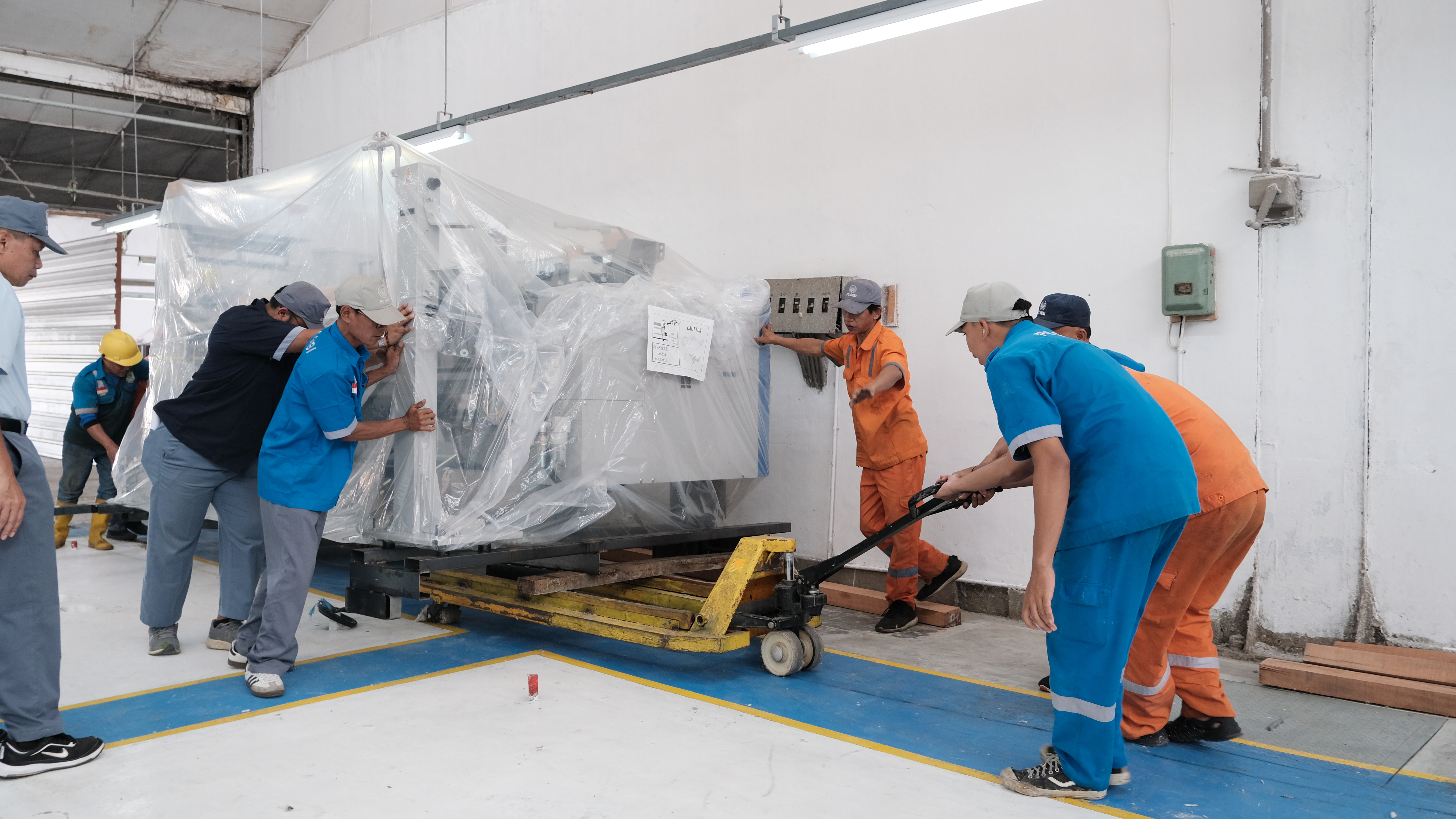 Setelah berhasil diturunkan dari kontainer, mesin JAT 910 kemudian dipindahkan menuju area produksi yang telah dipersiapkan sebelumnya. Proses pemindahan ini berlangsung hati-hati karena ukuran dan berat mesin yang cukup besar. Tim teknis mengarahkan setiap pergerakan forklift untuk memastikan mesin dapat melewati jalur pindah tanpa hambatan.